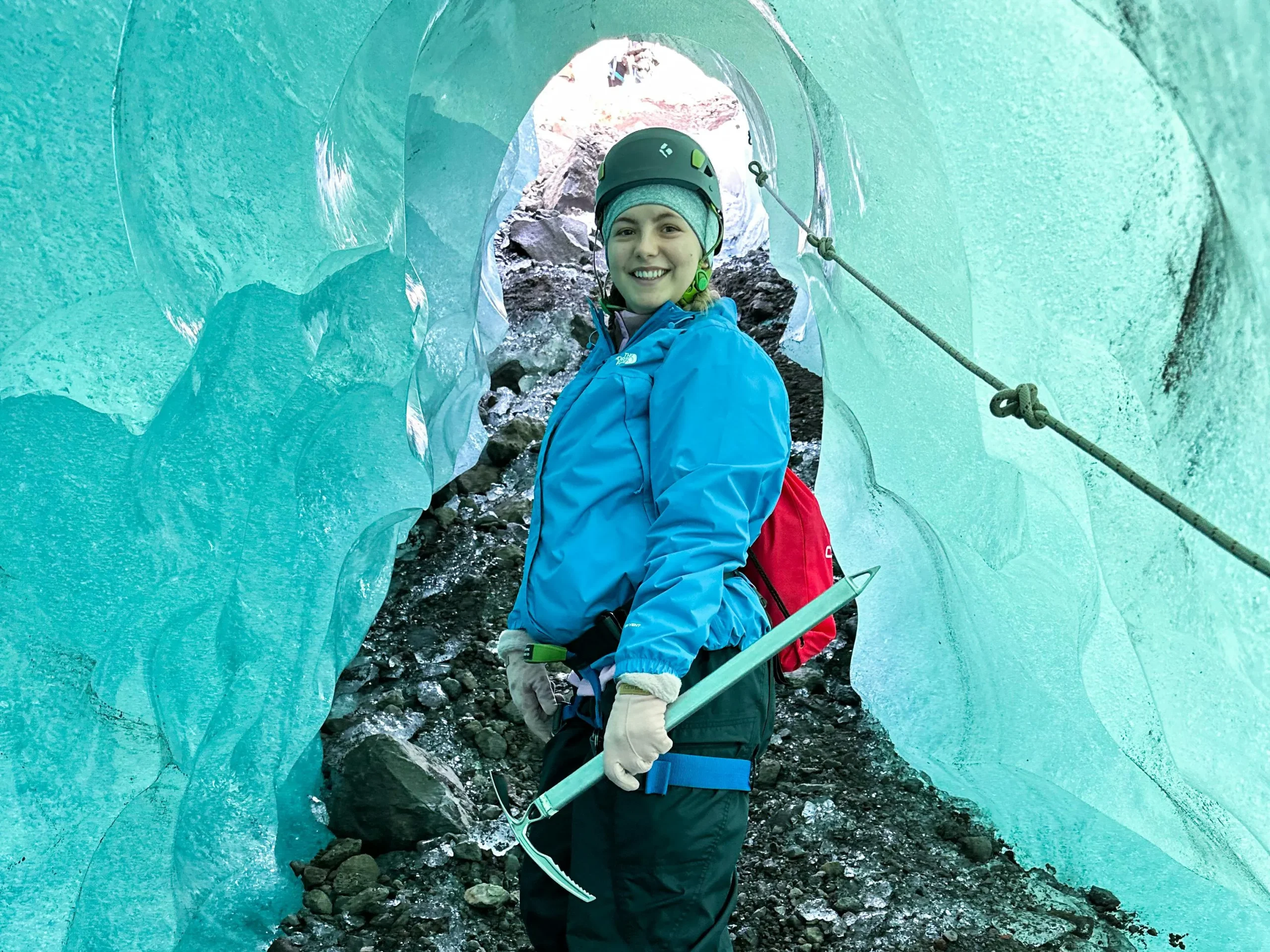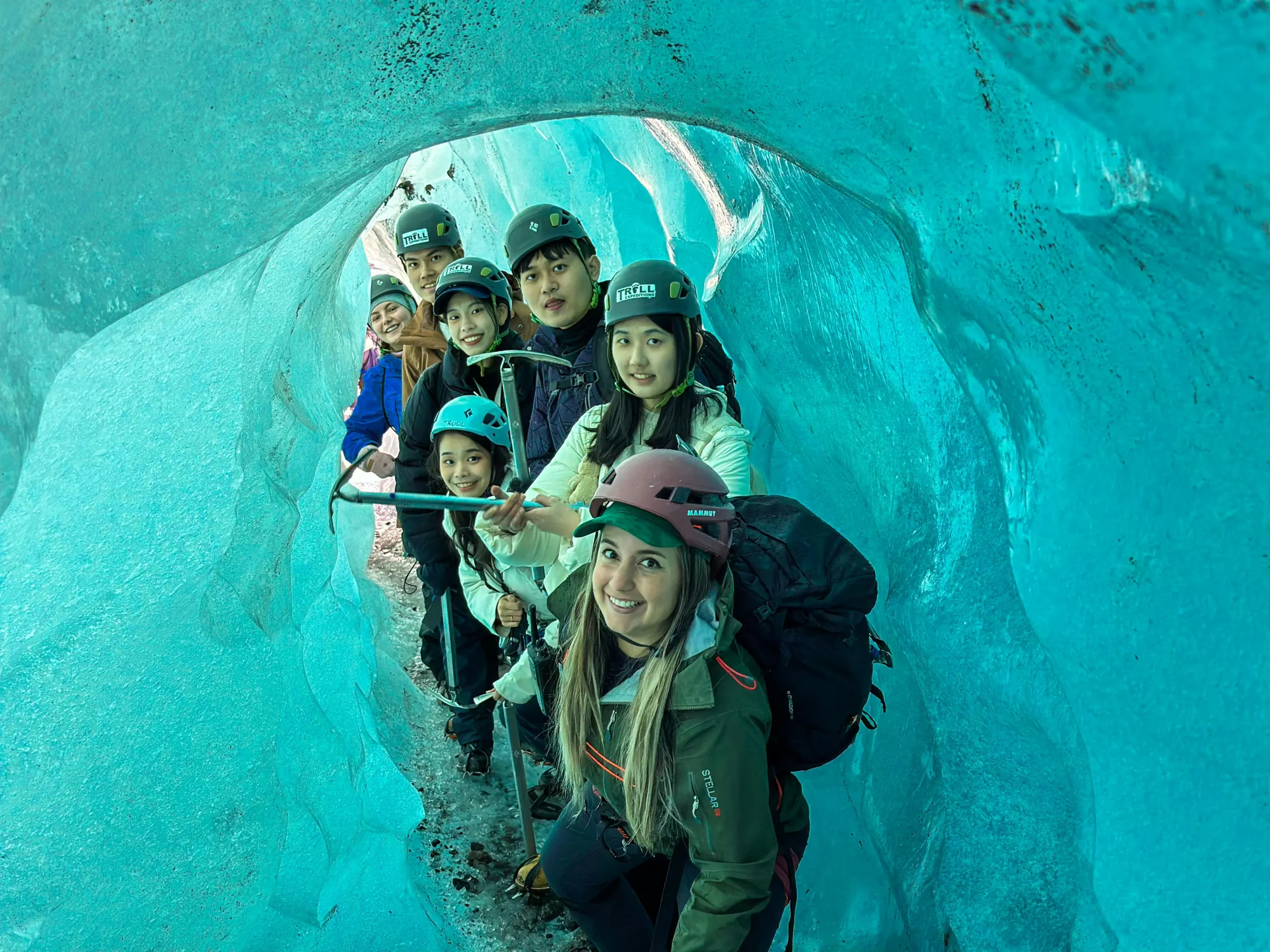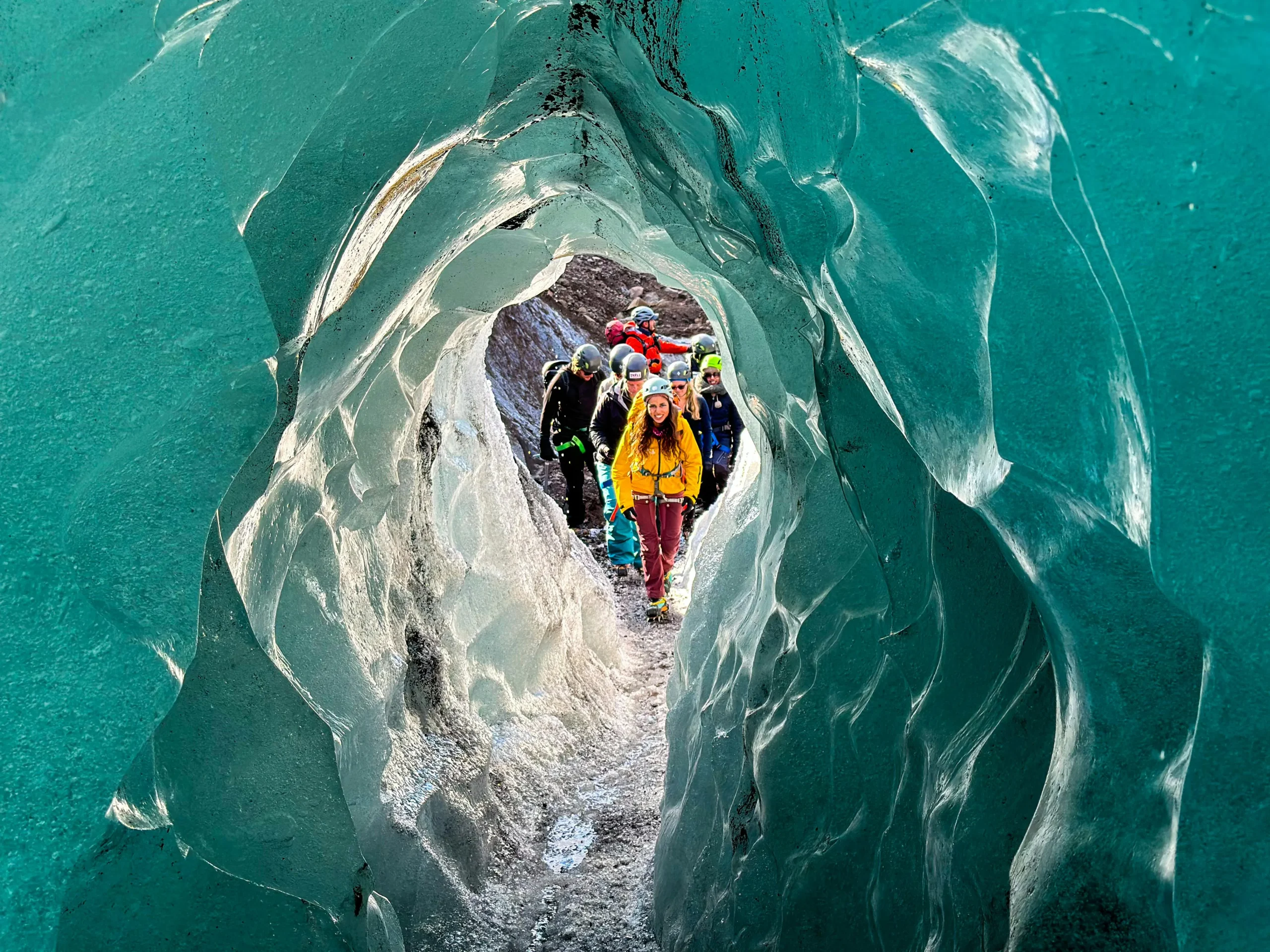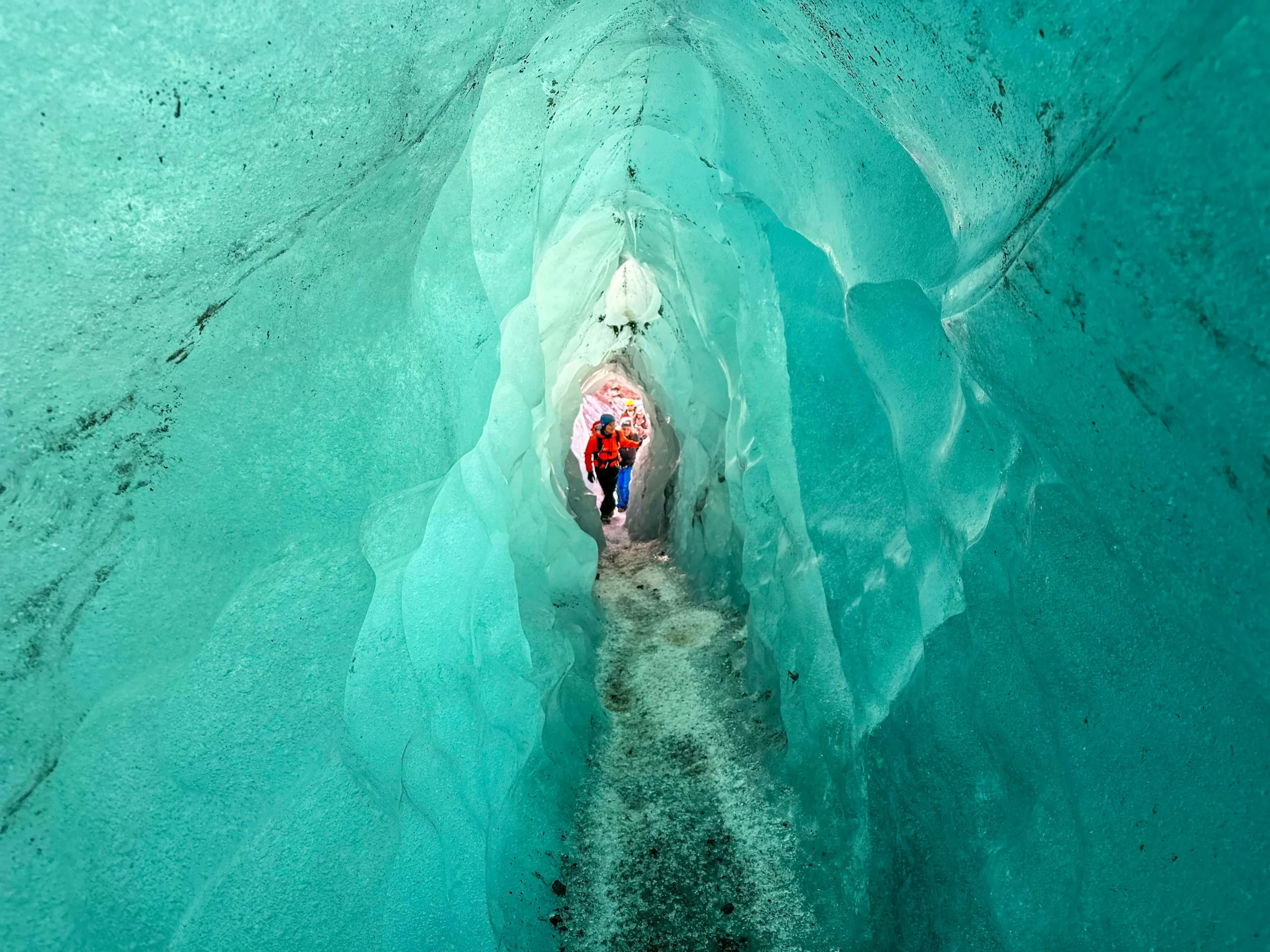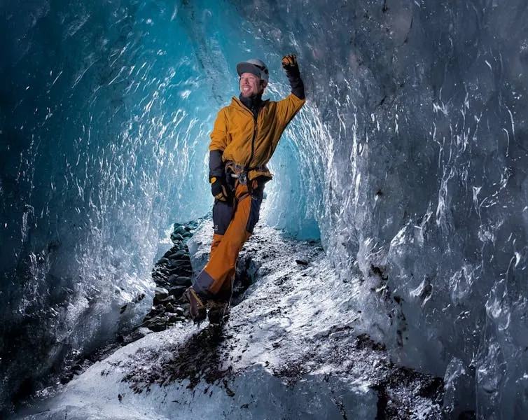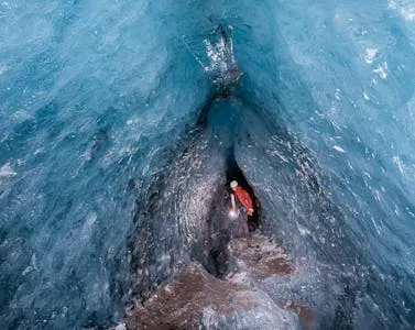 冰洞由融水在冰川內部長期沖刷形成,洞壁呈現透明而深邃的藍色。當陽光穿透冰層時,整個洞穴散發出冷冽而夢幻的光澤,使其成為冰川健行中最令人難忘的景象之一。