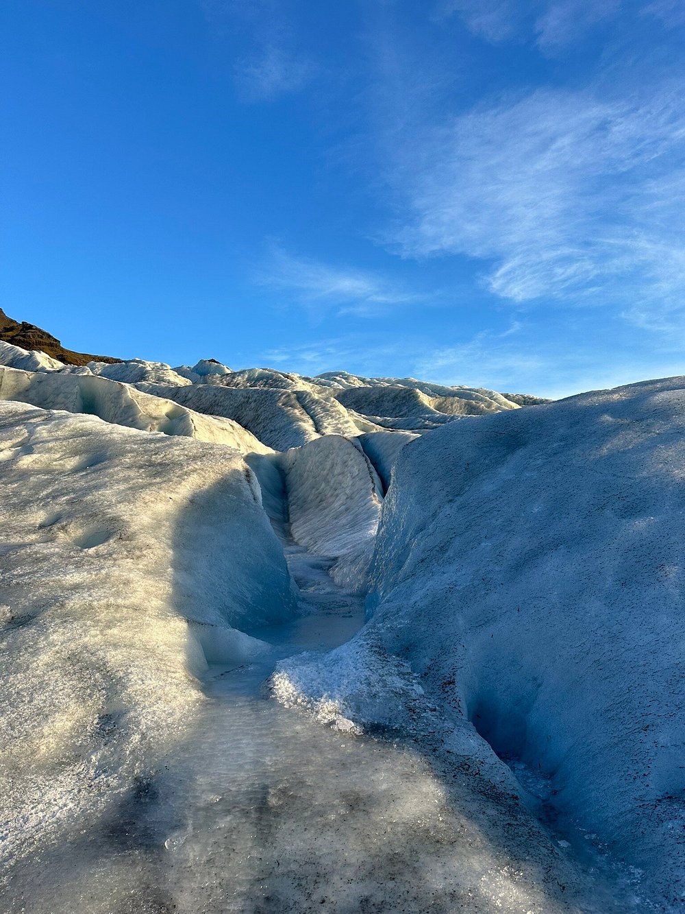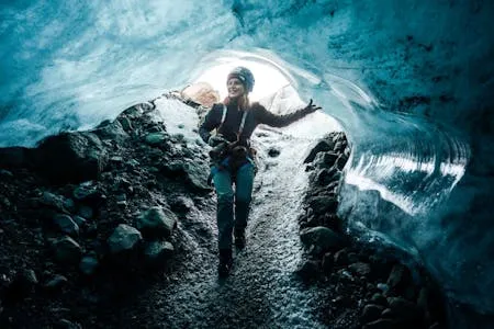抵達冰川邊緣後,旅人需要步行穿越冰川谷地。隨著高度逐漸上升,冰川景觀開始展現其複雜結構。冰裂隙(Crevasses)顯示冰層移動的力量,而冰洞孔洞(Moulins)則是冰川融水形成的垂直通道。行程亮點是探索天然藍冰洞。冰洞內部的藍色冰壁來自高壓壓縮的古老冰層,當光線穿透冰層時會形成深藍色光澤。這種景象只存在於冰川深處,因此每次造訪都可能看到不同形態的冰洞。在天氣晴朗時,旅人亦可遠望冰島最高峰華納達爾斯赫努克爾(Hvannadalshnjúkur)。周圍廣闊的冰川沙原(Skeiðarársandur)展示冰川與火山活動長期塑造的地貌。