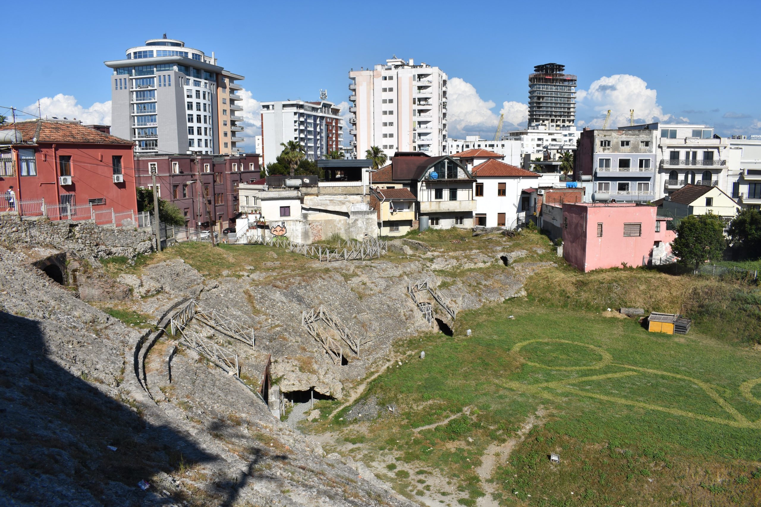 都拉斯圓形競技場建於公元一世紀初,羅馬帝國時期由皇帝圖拉真資助,位於阿爾巴尼亞都拉斯古城中心,為伊利里亞人聚落轉羅馬殖民地遺址,直徑約九十米,可容納一萬五千觀眾,以火山凝灰岩拱券結構象徵帝國娛樂文化。內部分三層看台,上層柱廊飾科林斯式柱頭,地下通道長二百米供角鬥士與野獸出入。二世紀哈德良統治期增建排水系統,應對地中海暴雨。文化脈絡記錄角鬥表演與基督教殉道事件,四世紀基督教化後棄用,族群包括羅馬軍團與希臘奴隸。地理上面向東南亞得里亞海,北接古城牆南連港口,競技場半埋地下層,視線由看台直達海灣。可觀察細節包括拱門拉丁銘文記錄公元一百零八年落成、看台大理石座椅刻觀眾姓名,以及通道壁龐貝風格壁畫殘片,展現古羅馬公共生活至考古發掘的歷史延續。