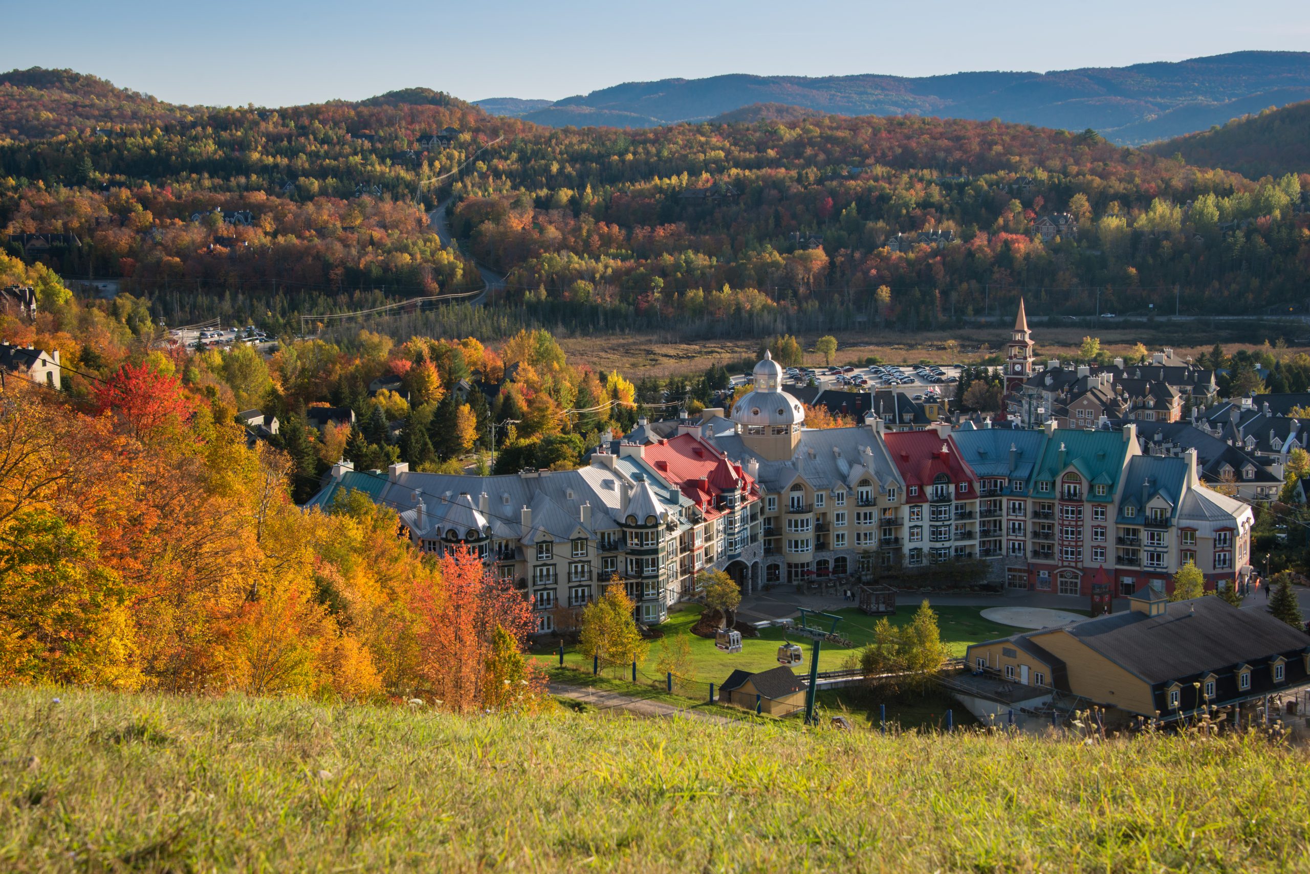 蒙特朗布朗步行村位於魁北克勞倫森山脈,十七世紀初為韋斯卡里尼阿爾岡昆原住民聚居地,稱「Soutana Trembling」山,因強風致樹葉顫動而得名。一八七二年教區神父安托萬·拉貝爾帶領歐洲移民定居,一八九二年鐵路通至聖喬維特村,一九○四年延至拉美西耶湖,促進伐木與農業發展。一九三八年約瑟夫·邦杜蘭·萊恩購地建蒙特朗布朗旅館,一九三九年首座滑雪纜車啟用,將原住民谷地轉為度假區。一九九一年Intrawest集團收購,擴建歐洲風格建築群,村區依山坡地勢布局,彩色木屋與石板路呈階梯狀,總長約一公里,連接酒店如Fairmont Tremblant與公寓,屋簷低斜,門窗飾鐵藝花紋,反映十九世紀移民對阿爾卑斯村落的再現。Cabriolet露天纜車免費貫穿村區,長約三百米,視線捕捉Rivière du Diable河谷與周邊楓林分布,空間機能分購物街、餐廳區與活動廣場,記錄二十世紀旅遊業對原住民土地的轉用脈絡。