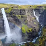 海福斯瀑布是冰島最高的瀑布之一,落差約122米,水流從高地邊緣直落入深邃峽谷。旁邊的姊妹瀑布格蘭尼瀑布(Granni Waterfall)與其並列而下,峽谷岩壁呈現出多層火山沉積岩色彩。