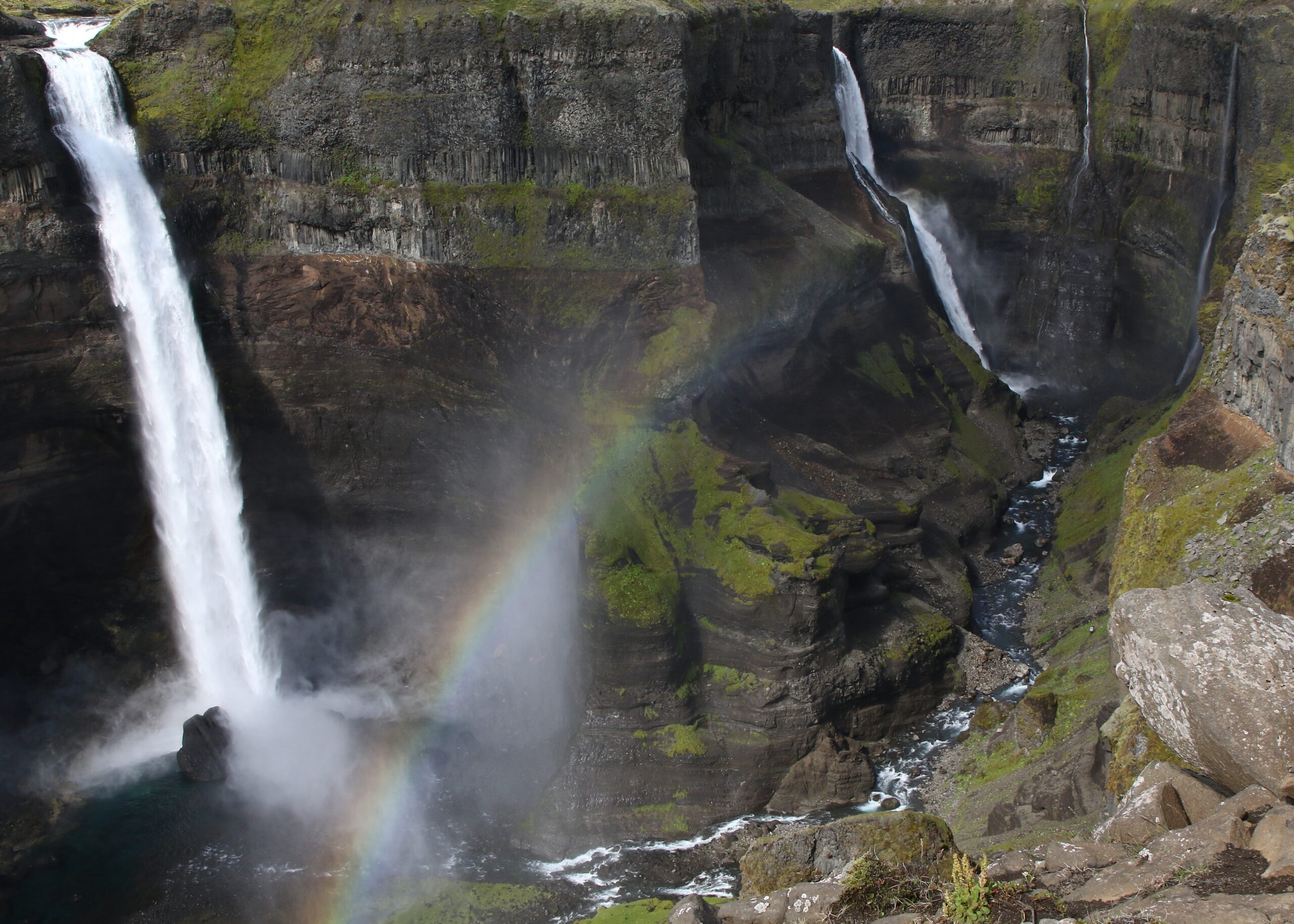 海福斯瀑布是冰島最高的瀑布之一,落差約122米,水流從高地邊緣直落入深邃峽谷。旁邊的姊妹瀑布格蘭尼瀑布(Granni Waterfall)與其並列而下,峽谷岩壁呈現出多層火山沉積岩色彩。