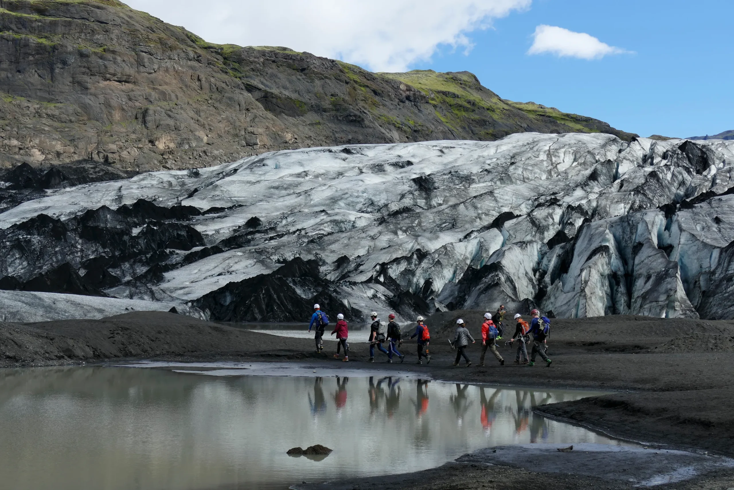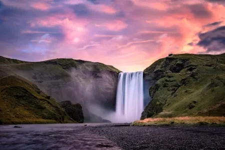 前往南岸,於塞里雅蘭瀑布可步行至瀑布後方觀景;斯科加瀑布落差約60公尺,沿階梯可登至頂端俯瞰海岸平原。隨後於冰川支流(如Sólheimajökull)進行約1.5小時冰川健行,由專業嚮導帶領並配備安全裝備(頭盔、冰爪、冰斧),了解冰川結構與地貌演變。
