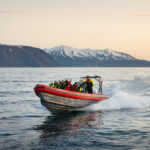 於午夜陽光下出航,搭乘高速 RIB 快艇穿越寧靜的海面。這場夜航結合了黃昏餘暉與深海探索,提供絕佳的攝影與觀鯨時機,尤以鯨魚、海豚與海鳥的身影,在金色光芒中尤為動人。