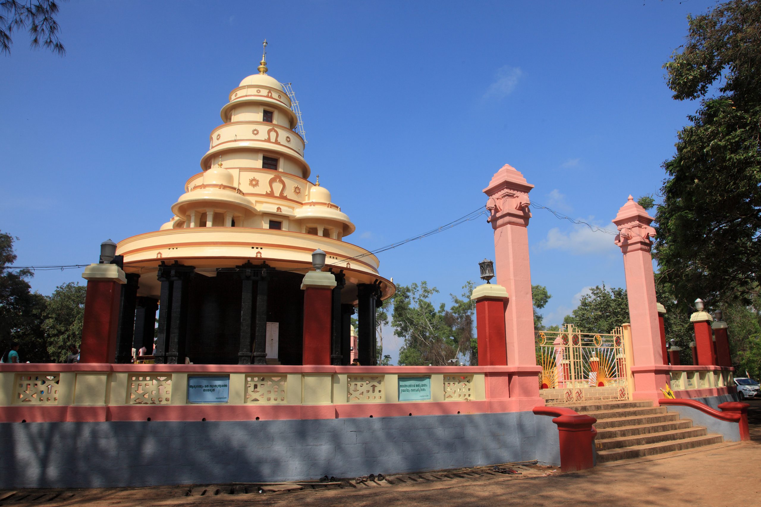 Sivagiri修道院建於1904年由Sree Narayana Guru創立,位於Varkala崖頂東側,占地5公頃石構主殿與紀念柱,Guru逝於1928年後成朝聖中心,象徵十九世紀喀拉拉種姓改革脈絡。建築融合德里風格拱頂與本地石灰岩,高25米內置Guru遺像。修道院西向海崖,視線平行庭院至燈塔,從柱基可循碑文辨識1928追思會序列。細觀包括牆刻馬來拉姆格言與燈籠鐵架,記錄All Religions Conference;周邊Ashram宿舍延續教育傳統。此修道院折射喀拉拉社會運動與精神遺址的空間延展。