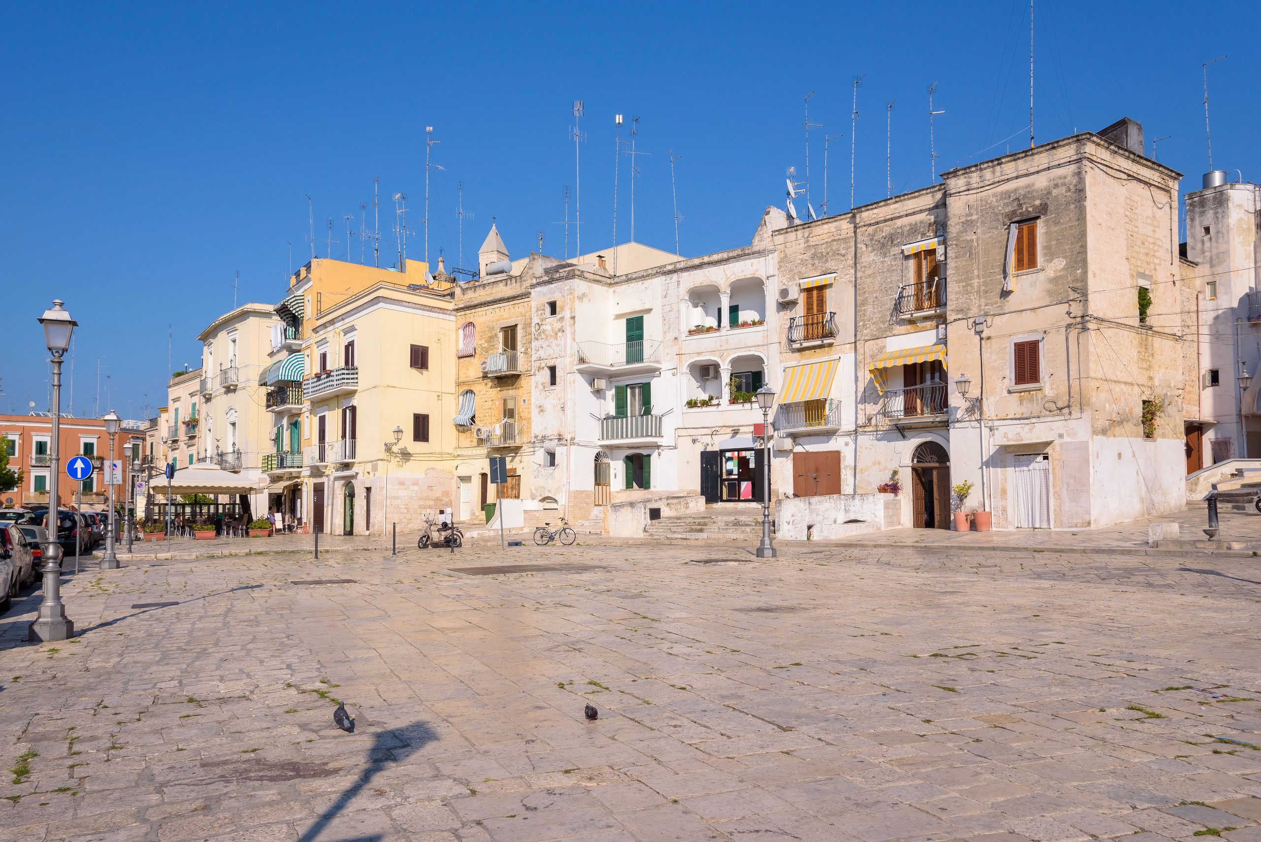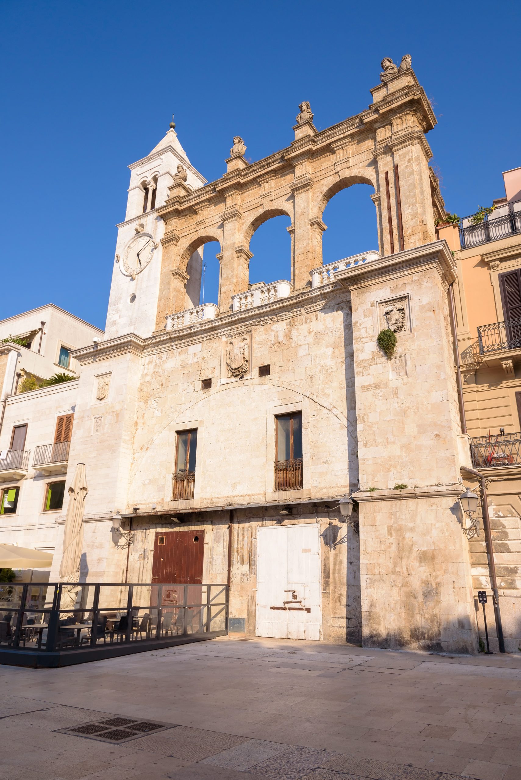 費拉雷塞廣場於一六一二年開闢,名源自十七世紀費拉拉商人史蒂法諾·法布里,其貿易倉庫環繞廣場邊緣。羅格德奧宮十七世紀巴洛克立面主宰一側,飾以雕花陽台與石灰華細節,今為巴里市立博物館。廣場面向老港與奧古斯都海濱,東南方位便利貨物卸載,北連梅爾坎蒂萊廣場。近期修復暴露地面阿庇亞大道二世紀遺跡,車輪溝槽清晰可見,象徵羅馬帝國貿易網絡。左側穆拉特廳原為十九世紀糧倉,現轉文化場域,毗鄰瓦利薩教堂十一世紀後殿。廣場周邊融合中世紀至現代建築,石板鋪地與宮殿拱券構成視覺層次,記錄港口商業演變。
