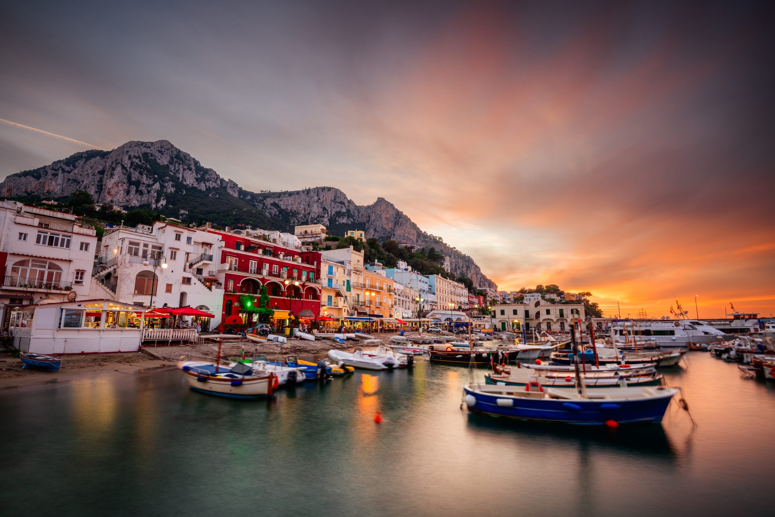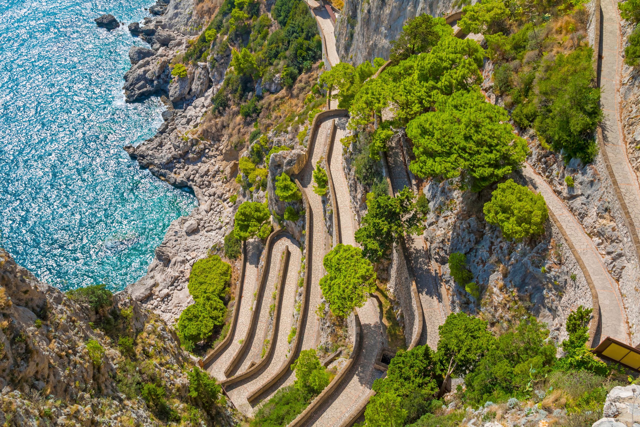 卡普里島,位於那不勒斯灣,因其陡峭的地形、獨特的酒店和購物選擇而聞名,從高級時尚到檸檬酒,再到手工皮革涼鞋,應有盡有。從那不勒斯的貝韋雷洛碼頭出發,搭乘水翼船約一小時即可抵達卡普里港。抵達後,若海況允許,可乘船遊覽著名的藍洞,或環島遊覽各個特色洞穴。港口位於島的北部,步行可見酒吧、餐廳和典型商店,短暫購物後可前往馬里納格蘭德海灘。
