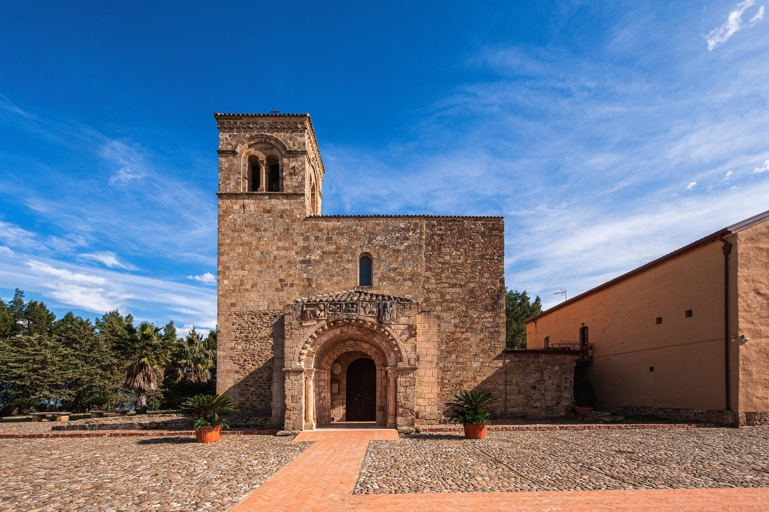 安格洛納聖瑪麗亞聖殿建於十一世紀諾曼時期,原址前四世紀赫拉克利亞郊外祭祀場,使用花崗岩與拜占庭馬賽克,內部三廊中殿飾聖母浮雕,高穹頂十二世紀重建。十四世紀盧塞利亞僧侶擴建迴廊,象徵基督教取代希臘多神教脈絡,十九世紀地震後修復。地理居波利科羅東北十五公里丘陵,海拔四百米,空間環以杏樹園,視線連考古公園遺址。細察門楣,可辨諾曼雙頭鷹與前羅馬磚塊重用,牆內嵌前五世紀陶片銘文,記錄中世紀朝聖路線與馬格納格雷西亞遺產交融。