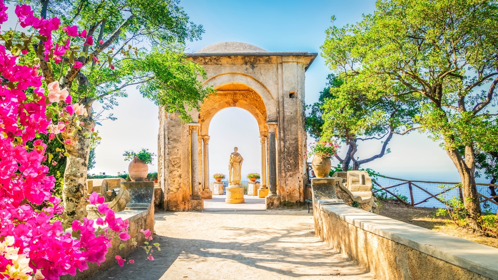車程約 90–120 分鐘。漫步於懸於海上千呎之巔的中世紀山城,從觀景露台俯瞰 Minori 與 Castiglione 海岸。可自行造訪拉維洛音樂節名地——Villa Rufolo 魯佛洛別墅。拉維洛位於意大利阿馬爾菲海岸山崖上,建於九世紀,由隆巴德貴族建立,作為防禦據點,十一世紀諾曼人統治後轉為文化中心,吸引文藝復興時期藝術家聚居。一二七○年阿雷基諾家族資助興建聖尼古拉教堂,以羅馬式拱門與彩色大理石鑲嵌象徵天主教擴張,鐘樓高三十米俯瞰蒂雷尼海。文化脈絡記錄中世紀絲綢貿易與詩人貝爾加爾多創作,族群融合諾曼與阿拉伯影響,保留拉丁銘文石碑。地理上坐落海拔三百五十米台地,北接拉維洛峽谷南望阿馬爾菲灣,村區呈階梯布局,廣場周邊庭園種植檸檬與橄欖。可觀察細節包括教堂內拜占庭風格聖像壁畫、別墅魯法洛牆上十三世紀浮雕,以及花園噴泉水道記錄一四八○年水壩修建,展現山地聚落從軍事到藝術功能的演變。