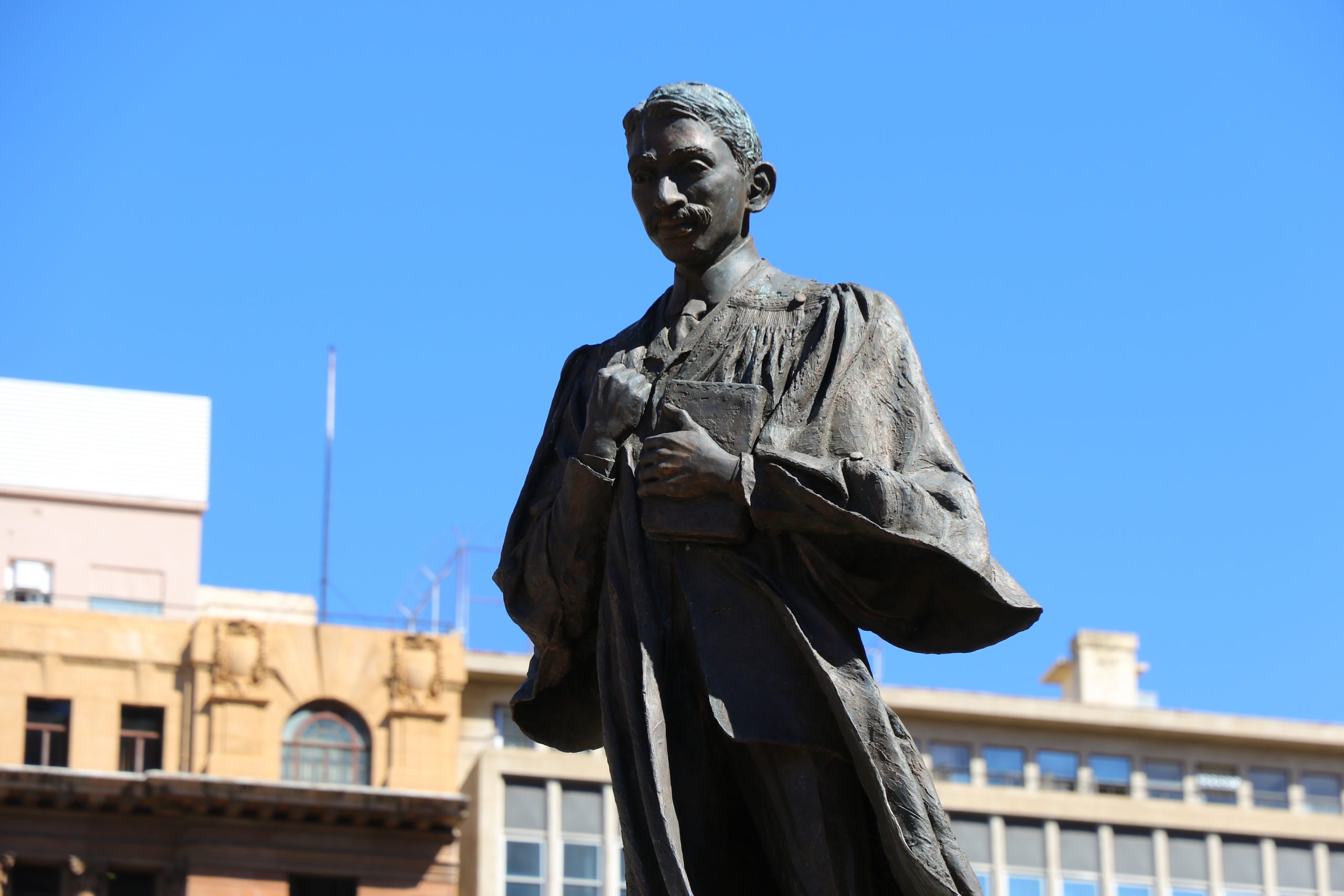 甘地廣場原名政府廣場,建立於1900年約翰尼斯堡首座法院址,位於中央商務區,1900年5月31日英布戰爭結束時,英國元帥羅伯茨在此接受德蘭士瓦共和國投降。廣場曾稱范德比爾廣場,1999年改名紀念甘地,2003年豎立2.5米銅像,呈現年輕律師袍姿,位於Metrobus總站中心,周邊維多利亞式建築環繞。空間寬闊開放,視線北向安德森街法庭舊址,甘地1893至1914年在此執業,推動非暴力抗爭。細節包括銅像基座刻投降紀年及周邊街藝,象徵殖民轉型後種族平等脈絡。
