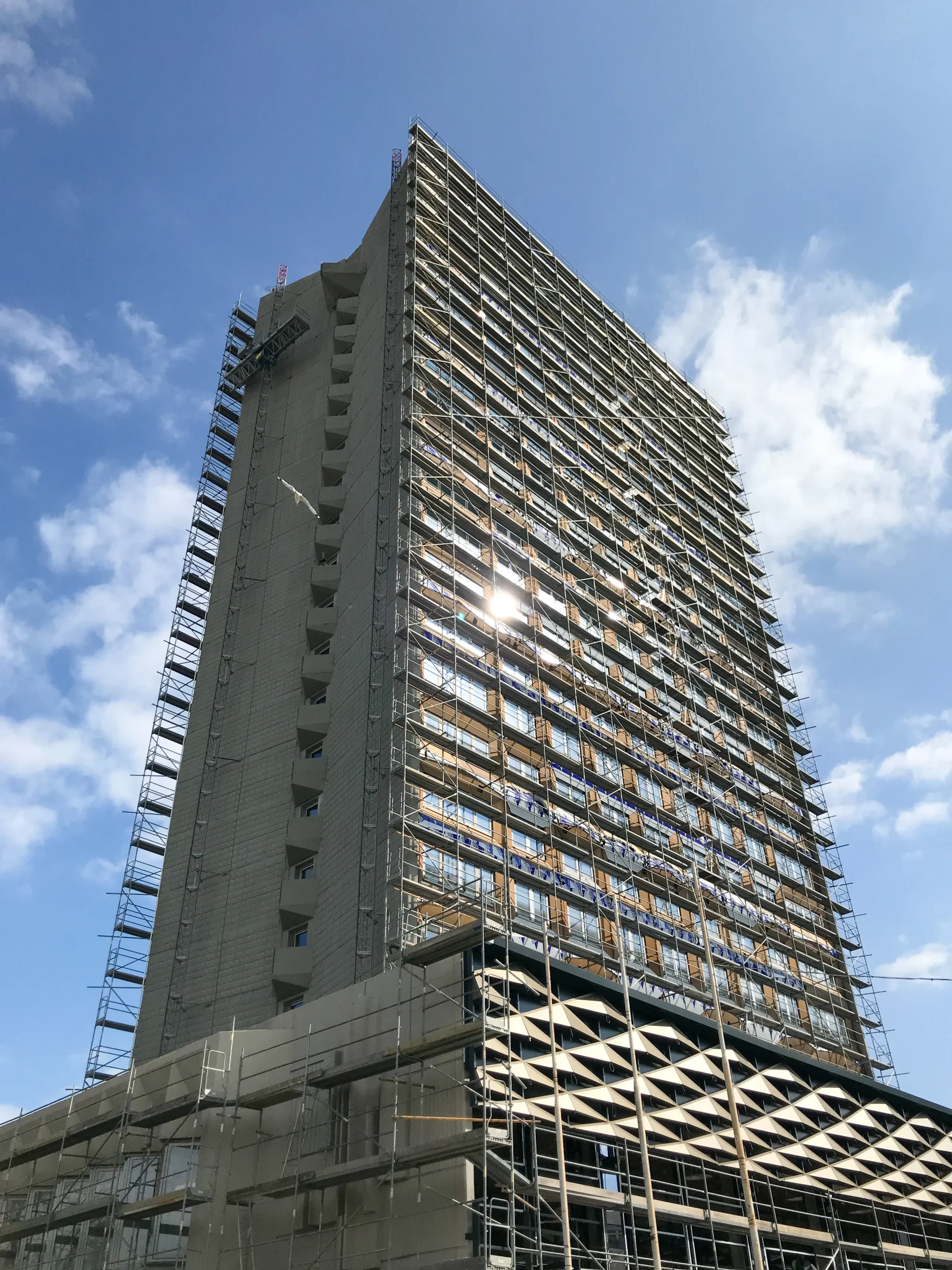 霍爾馬克大樓天台位於約翰尼斯堡中央商務區,建於二十世紀中葉現代主義風格,十九層結構以混凝土及玻璃幕牆構成,原為商業辦公轉型藝術空間,高約60米,提供360度城市全景。平台設鐵欄及座椅,俯瞰希爾布勞及布瑞肯希爾舊區,視線南向憲法山北望馬博能街區,昔日為種族隔離時期銀行總部。空間分觀景區及咖啡吧,細節包括天台風向標刻建築年份及地面防滑磚,象徵約堡從金礦經濟轉向後工業城市再生脈絡。