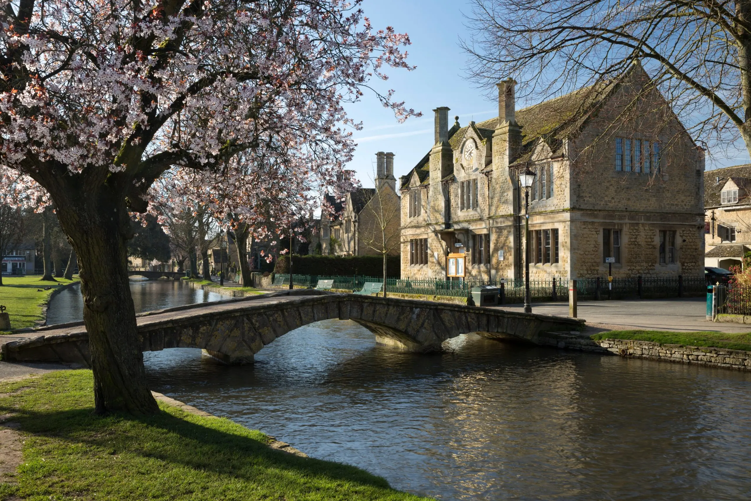 Bourton-on-the-Water 位於溫德拉什河沿岸,村中心一段河道寬度適中、水位較淺,多座低矮石橋橫跨其上,因此有「科茨沃爾德小威尼斯」之稱。 十八至十九世紀,隨著公路網與旅館出現,村落逐步由傳統農牧與小規模手工業轉向服務通行旅人與度假者,街道兩側出現兼具住宅與商業功能的石造樓房。從建築立面可見大面積窗戶與店面招牌,與早期較封閉的農舍形成對比,顯示公共空間與視線的開放程度提高。 村內道路與河道平行或交錯,橋梁位置成為人流匯聚點,周邊常見綠地、長椅與教堂塔樓,構成一套兼具交通、景觀與社交功能的空間節奏。觀察河岸護牆、步道鋪面與洪水高位標記,亦可讀出地方政府如何在保留歷史景觀與應對極端降雨之間調整工程設計。